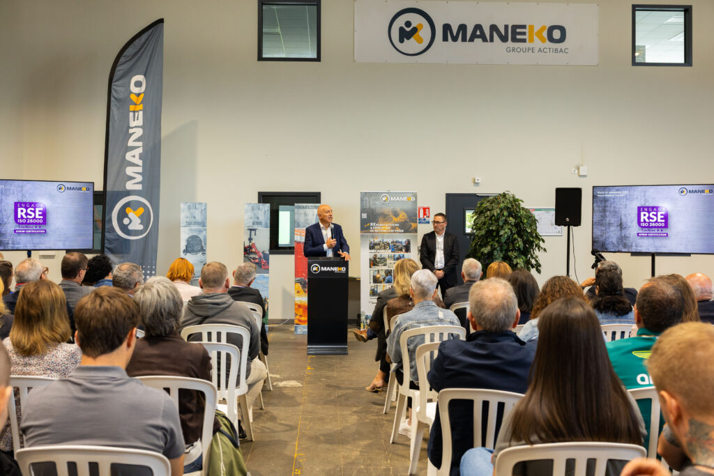 « Remise officielle de la certification RSE par l’Afnor à Maneko, filiale du groupe Noremat. Cette entreprise développe depuis cinq années une activité de remanufacturing de matériel de chantier. Économiser l’acier, donner une seconde vie aux outils, investir dans la qualité de vie au travail et l’insertion professionnelle. Bref, une entreprise du futur. »
